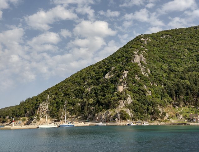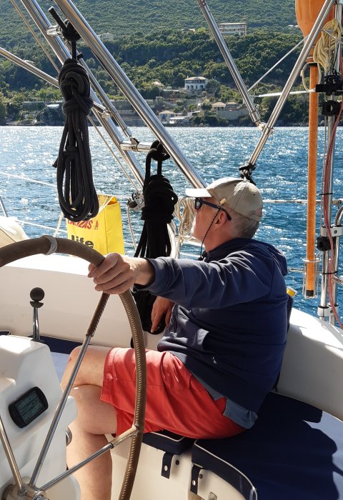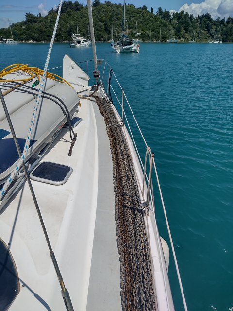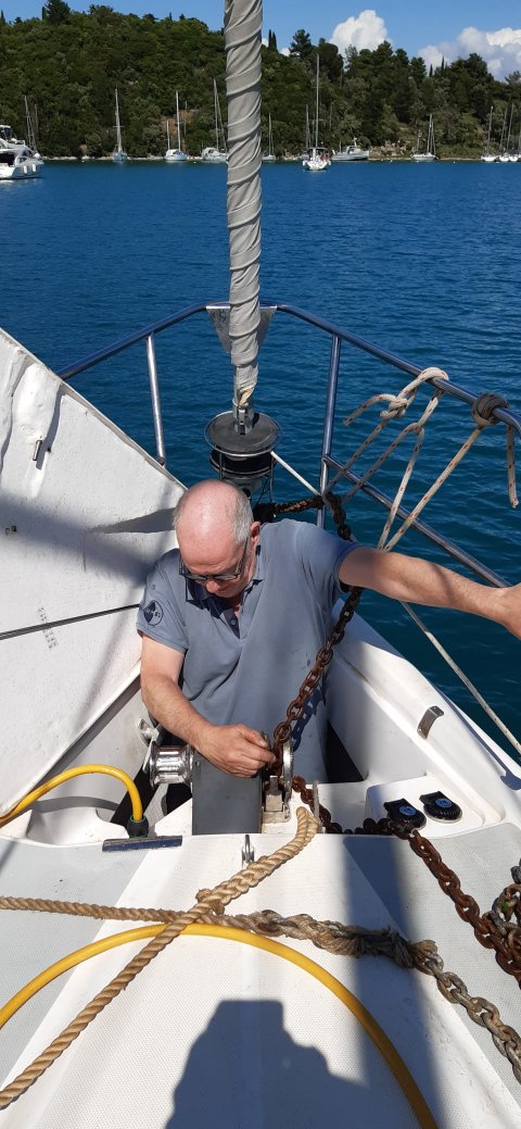 På lördag 14/5 måste vi vara på Corfu, så nu var det dags att ta den långa etappen (60 nm) norrut då vindarna var någorlunda på vår sida så vi slipper motorisera. För att hinna fram i dagsljus blev det ändå lite motorgång / motorseglande och efter 12 timmar ankrade vi upp i Mongonisi på Paxos sydspets.