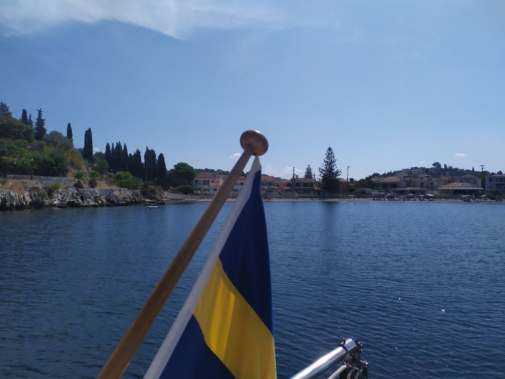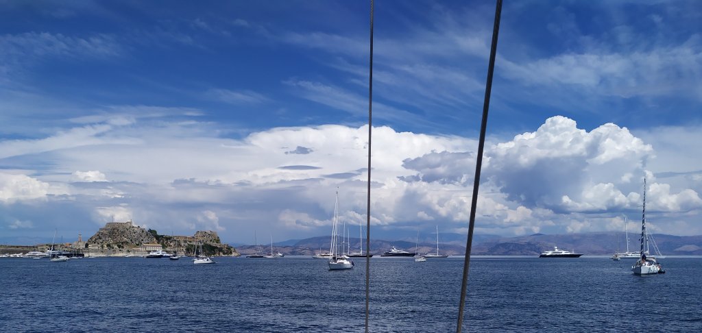 Över ”fjärden” (12 nm) till Corfu town igår gick i motorseglandets tecken. Typ ingen vind. Nåja, någon sekundmeter då och då… Kastade ankar i Ormos Garitsas där vi legat förut, och lyckades på tredje försöket släppa ankaret på en sandfläck. Viken har väldigt mycket ”weed” eller ”kelp” dvs tjockt sjögräs, och hamnar ankaret på kelpen glider det bara utan att få fäste.