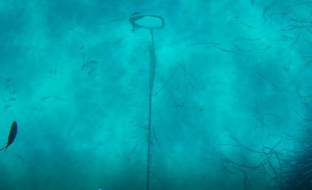 Flera grottor, kristallklart vatten och c:a 5 meters djup i hela viken.Passade också på att dyka ner och kolla ankaret, som hade grävt ner sig perfekt i sanden.och så lite nyfikna fiskar under båten (rodret ses uppe till höger).