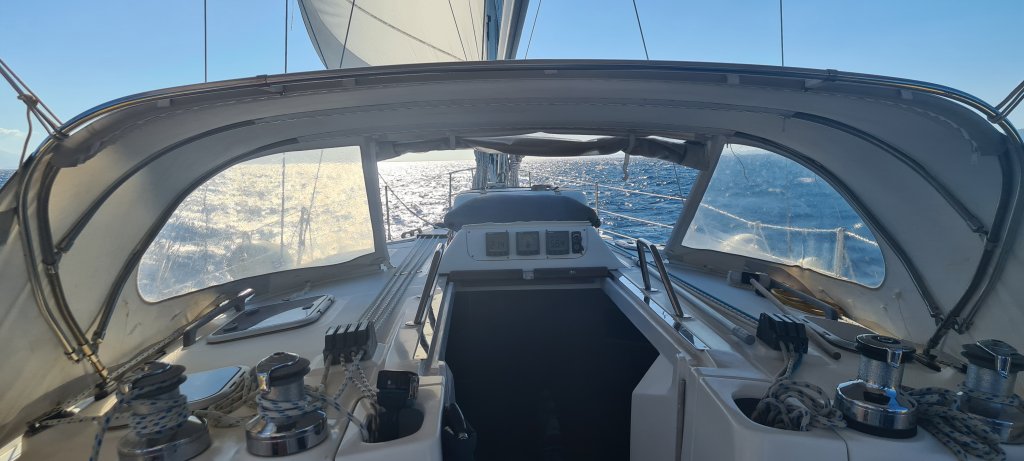 Bra fart mot Paxos, 12 m/s och 8 knop med revad stor och genua. Härlig gång genom sjön!