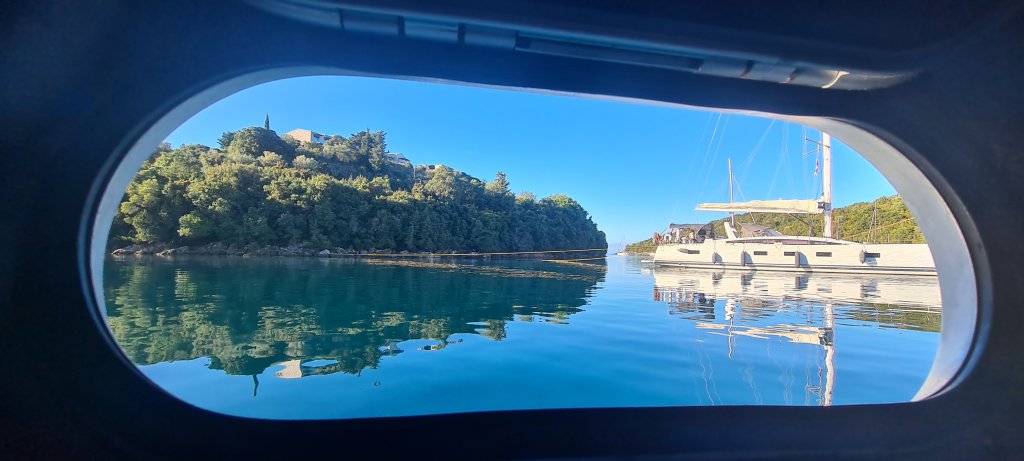 Framme i Lakkaviken slås vi av samma sak som igår i Sivota, nämligen att det helt plötsligt, iom oktober och lågsäsongspriser på båthyra, dels är fler båtar ute än för 1-2 veckor sedan, och dels att besättningarna är klart mer inkompetenta. Det snurras, ankras, draggas, flyttas, en båt höll på att segla upp på land vid norra udden vid inloppet, andra lägger sig alldeles för nära bl.a. oss och tvingas inse tabben och flytta, men till slut, strax före mörkrets inbrott verkar alla ligga okej…