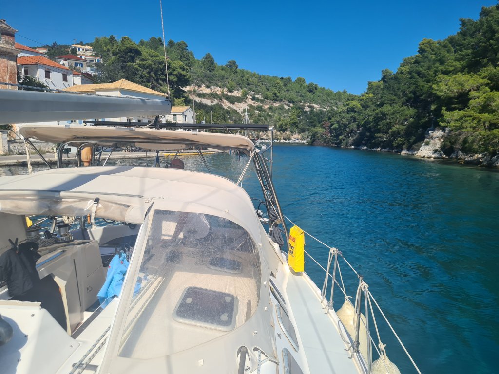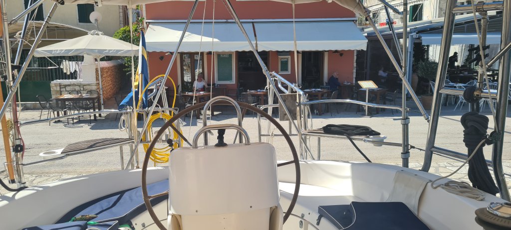 Dagen efter går vi iväg hyfsat tidigt de få nautiska milen till Gaios, och en timme senare är vi framme. Då, runt lunch, finns det gott om utrymme och vi hittar direkt en bra plats direkt utanför en av de bästa restaurangerna, Mambo.