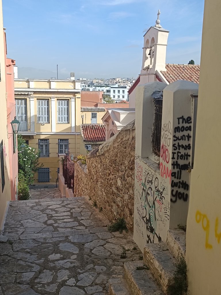 Många små kyrkor/kapell finns det, och mycket graffiti…På väg upp till klippan med staden i bakgrundenTrappan vid entren till Acropolis med den ursprungliga entren, PropylaiaParthenon, Athenas tempel