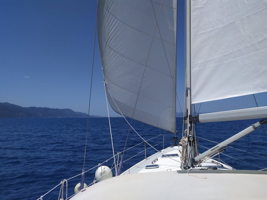 Efter några dagar i Kyllini blev så vindarna gynnsamma för att gå över till Zakynthos, men som oftast i Grekland blåser det lite som det vill… Omväxlande motorgång och motorsegling halva vägen, och sen satte sydosten in och vi fick en fartig slör då vinden ökade till 10-12 m/sek innan vi var framme och kunde lägga till längst ut på piren.