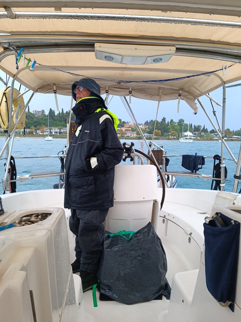 Vi stannade på Korfu sammanlagt i tre veckor, där finns mycket att se och Korfu har verkligen blivit en favorit. Regnovädren fortsatte att komma och gå. En eftermiddag kom ett vindskifte, kraftiga vindar med regn och Fredrik fick användning för sitt regnställ för första gången här nere.