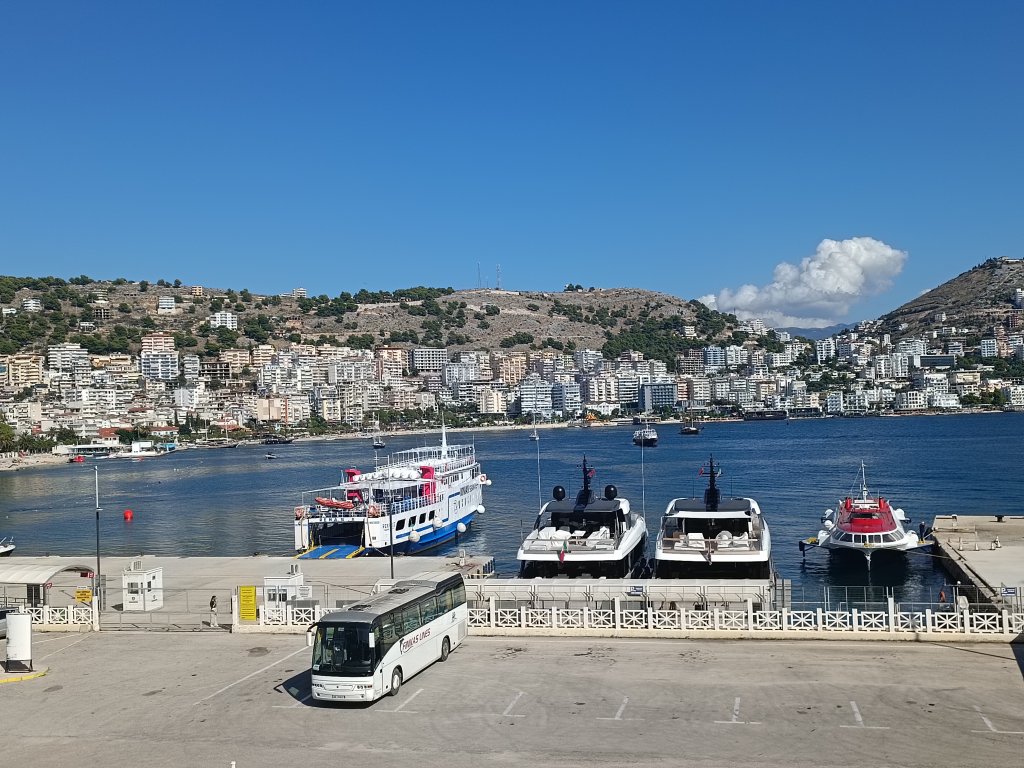 En dag i slutet av vår vistelse tog vi en färja över till Saranda i Albanien, det är nära över, färjan tar en timme. Saranda är en ganska stor stad och en albansk turistort, beläget i en stor bukt med lång badstrand. Vi gick längs strandpromenaden och på de hela(!) trottoarerna som verkligen skiljde sig från Korfus där trottoarerna är mycket smala, trasiga och oftast används som parkeringsplats för bilar och scootrar. Ett par kvarter upp från stranden låg lite äldre bebyggelse där vi åt lunch på ett enkelt cafe.