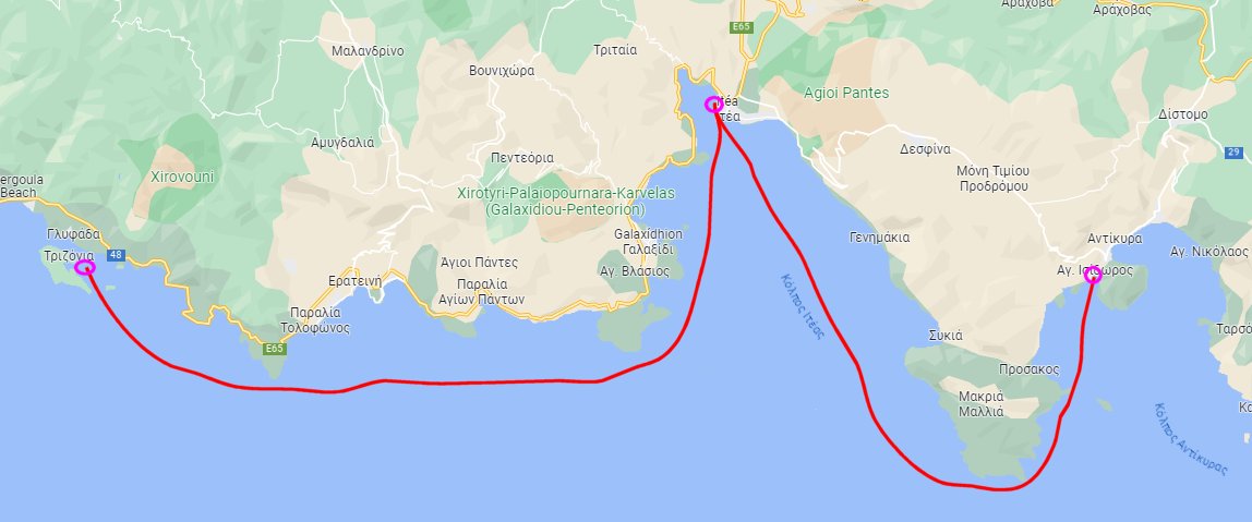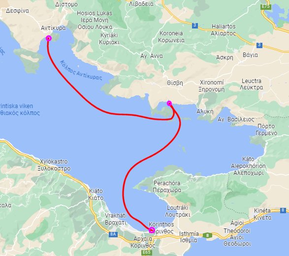 Kyparissa – Monemvasia (20 nm, 15/6), Monemvasia – Velanidia (14 nm, 19/6), Velanidia – Agios Elena på Elafonisos (17 nm, 20/6), Agios Elena – Plytra (18 nm, 21/6)Porto Chéli – Nafplion t.o.r. 8 – 10/6. Dagtur Spetses t.o.r. 12/6. Porto Chéli – Kyparissa 14/6.Vagionia Bay, Poros – Porto Heli (Chéli) (33 nm, 6/6)Corinth harbour > kanalen > Korfos (22 nm, 3/6) – Vagionia Bay, Poros (24 nm, 5/6)Agios Isodoros – Ormos Agiou Ioannou (24 nm, 1/6) – Corinth harbour (22 nm, 2/6)Trizonia – Itea (24 nm, 28/5) – Agios Isidoros (20 nm, 31/5)Messolonghi – Trizonia 24 maj, under den mäktiga Rio-bron. 38 nm och vi närmar oss Korintkanalen!Astakos – Messolonghi den 21 maj. Sträckan blev 35 nm, ungefär som Saltis – Nynäshamn.Preveza till Astakos. Vi lämnade Preveza tisdag 16 maj, låg i Palairos i två dygn och gick sedan till Astakos 18 maj. 21 maj vidare mot Messolonghi.